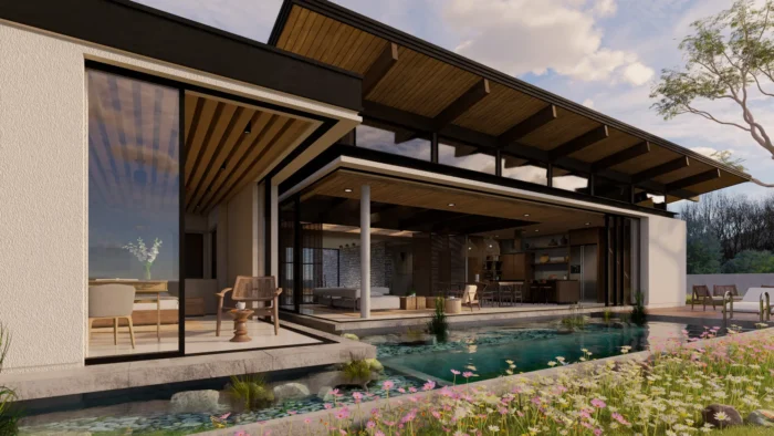 A Mid Century mordern home lies on the hill